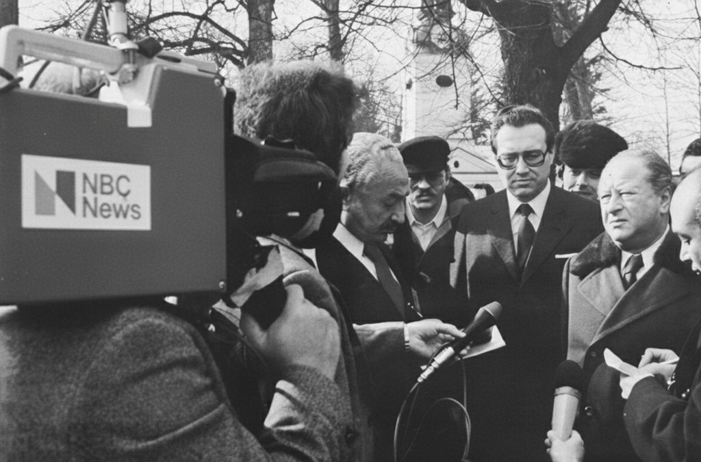 Improvisierte Pressekonferenz beim Empfang von Präsident Anwar as-Sadat mit Herbert Moritz in der Mitte.